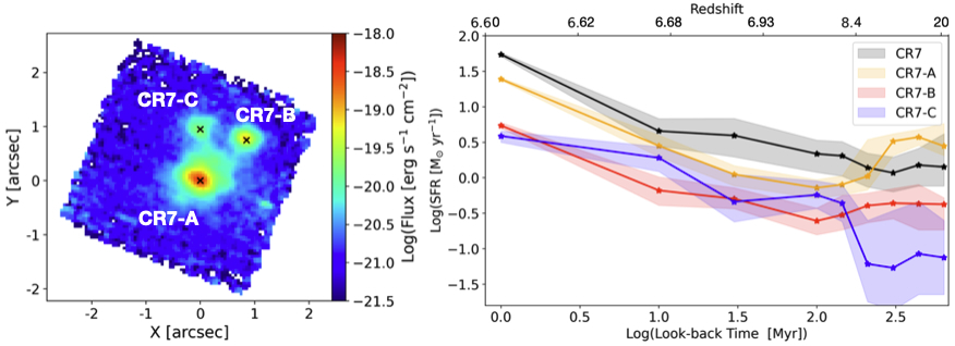 component structure of CR7. Right panel: SED-derived star formation history in each component of